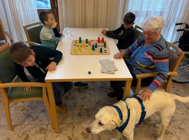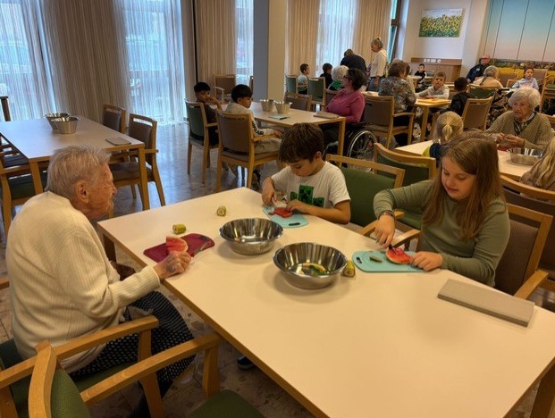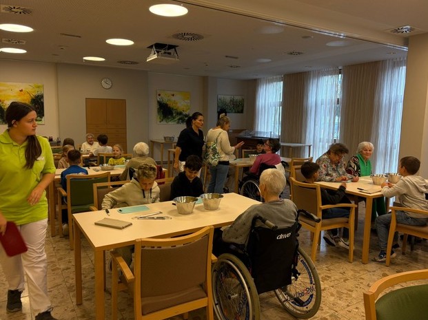 Die 3c besuchte am 09.10.2025 das Barbaraheim. Dort durften wir gemeinsam mit den Bewohnern Obst für einen Obstsalat schneiden und anschließend verkosten. Danach gab es noch lustige Spiele und Aron, der Therapiehund, kam auch vorbei.